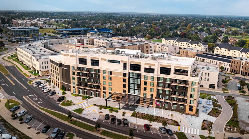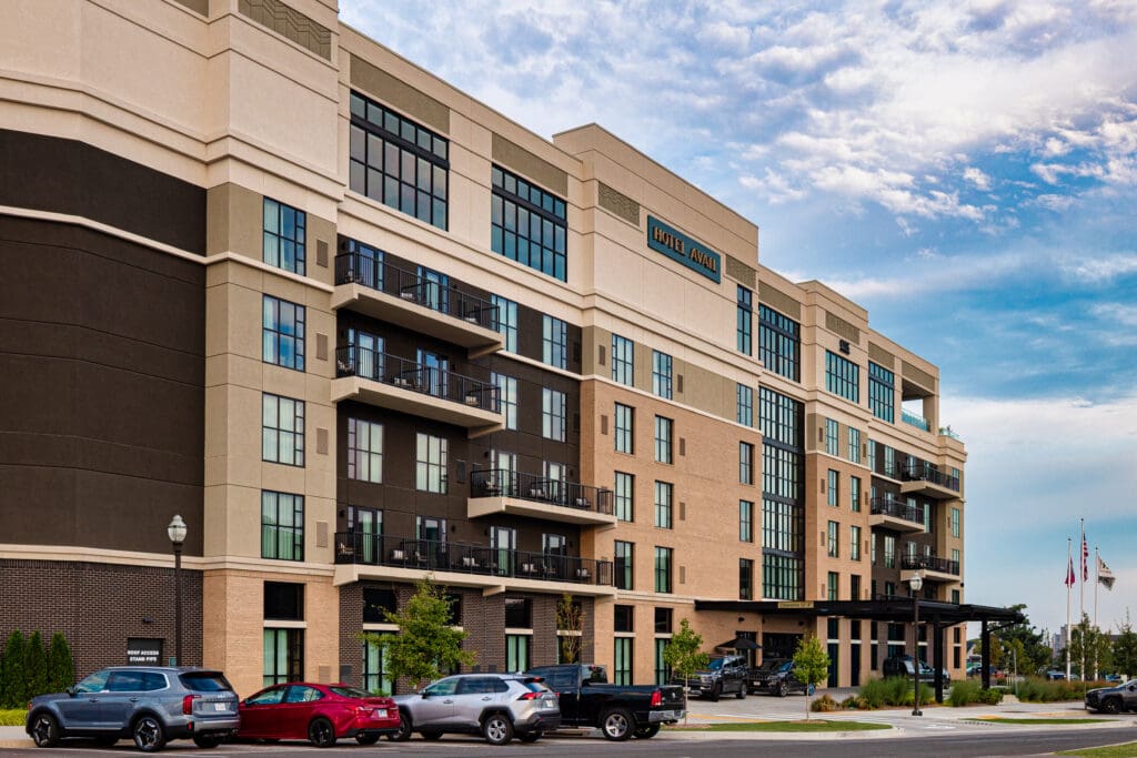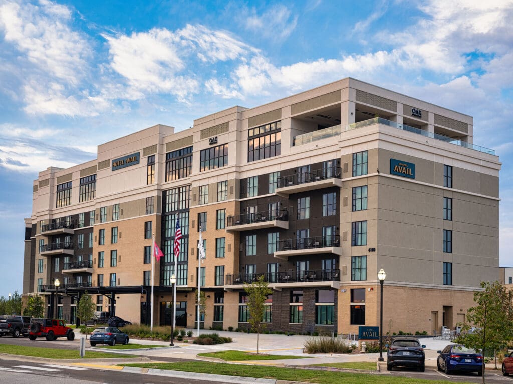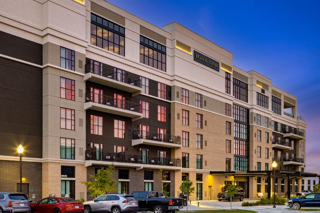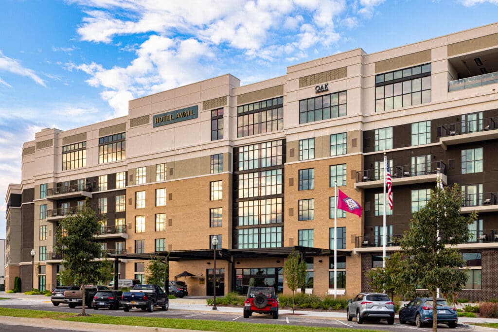 The façade designed for Hotel Avail complements the evolving skyline of Northwest Arkansas. The surrounding environment—retail, culture, green space—creates a narrative of arrival.